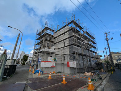 北中城村の美島通りに新築住宅兼集合住宅建築中。RC造地上3階建て、総戸数7戸、間取り1LDK33㎡(6.4万円~)、駐車場有。2025年10月完成予定。